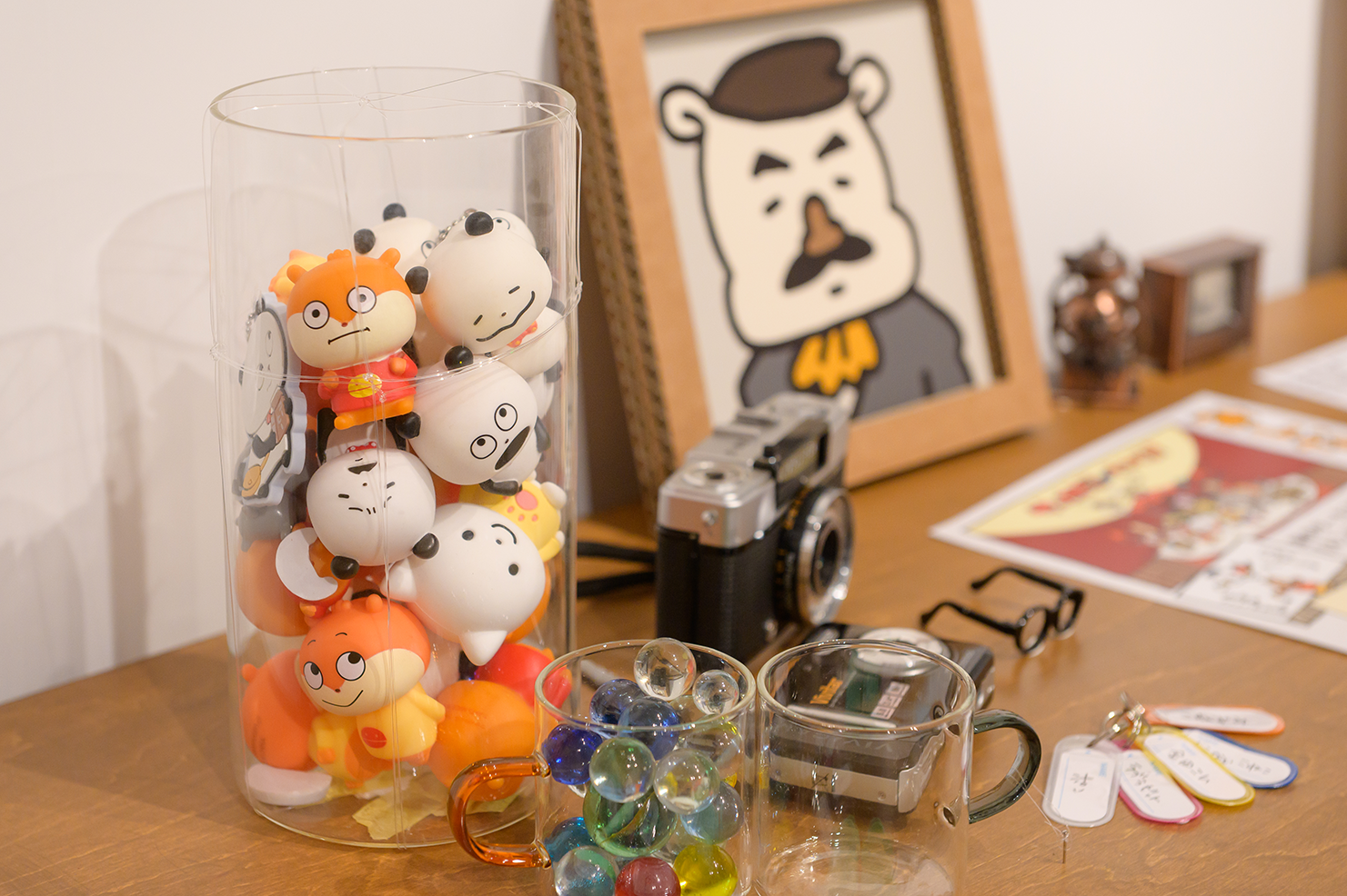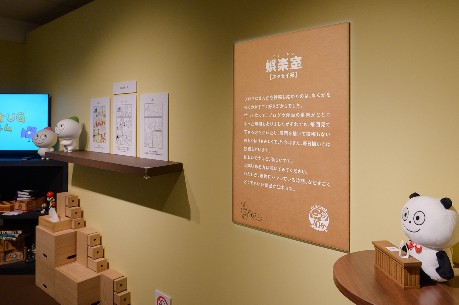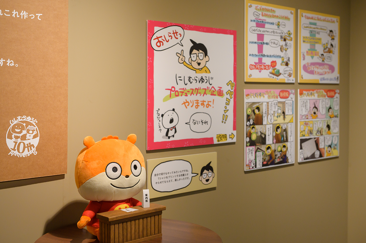 にしむらゆうじ氏が生み出した「スタジオUG」の仲間たちやどうぶつ国に関する作品を展示。日頃SNSなどで公開しているイラストやキャラクター紹介などのパネル展示に加えて、制作道具や小ネタが随所に散りばめられ、にしむらゆうじ氏のひみつに近づく展示内容となっています。